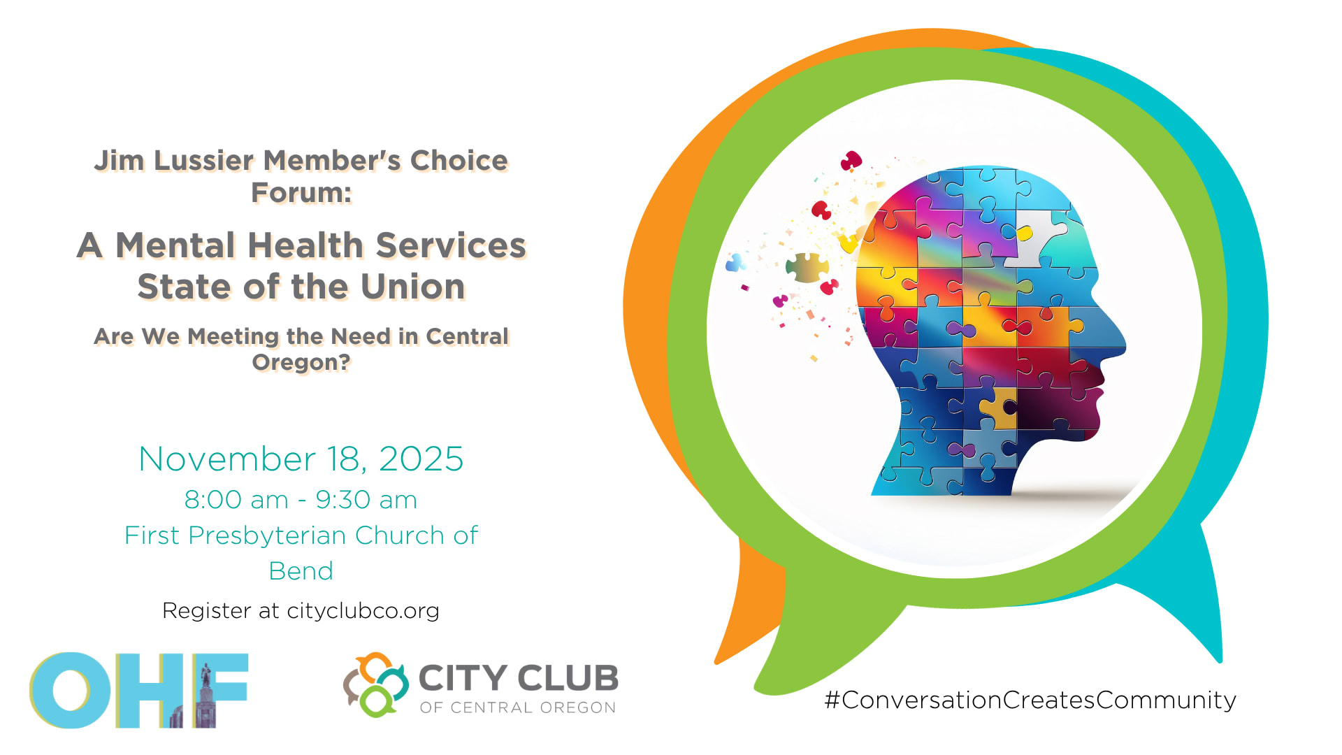Join this timely and candid conversation on the current state of mental health services in Central Oregon offered in collaboration between City Club of Central Oregon and the Oregon Health Forum. We'll explore key issues including provider shortages, barriers to care, community-based initiatives, and the impact of recent policy changes. Local experts and advocates will share data, personal stories, and challenges to help build a more resilient, responsive mental health system.
