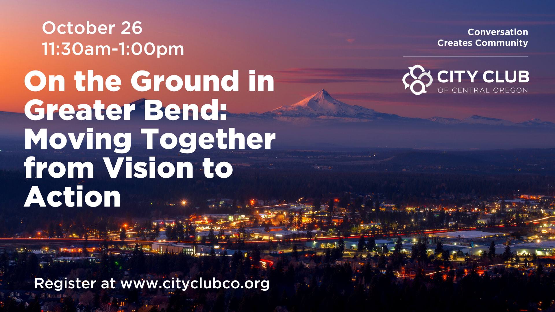 Working with thousands of community members, Envision Bend has created the 2023 Greater Bend Vision Plan. Join City Club for a discussion about catalyzing our community's vision into being.. Moderated by former state senator Neil Bryant, this forum will provide an overview of the four key plan focus areas - Building an Economy for Everyone, Guiding Our Growth & Development, Cultivating an Inclusive Community, and Ensuring a Safe, Healthy Environment - and then put YOU in the driver's seat. In small groups at your tables, you will drill down on the Building a Better Economy focus area to consider how best to advance the strategies, activate the stakeholders, and achieve the vision for us all. Please join this highly interactive City Club and learn more about the future we can accomplish, together.